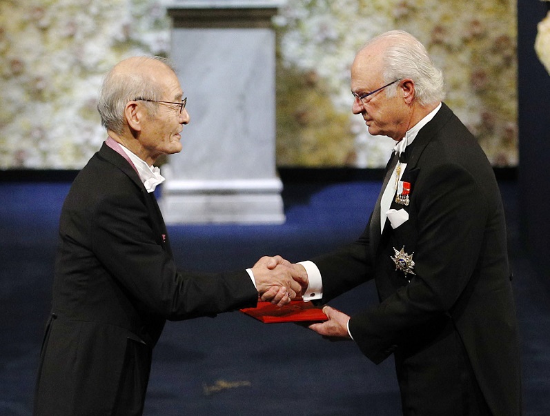 スウェーデンのカール16世グスタフ国王(右)からノーベル化学賞のメダルと賞状を授与される吉野理事長(左)(写真:共同通信社)