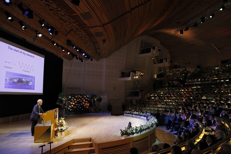 ストックホルム大学で受賞記念講演をする吉野理事長(写真:共同通信社)