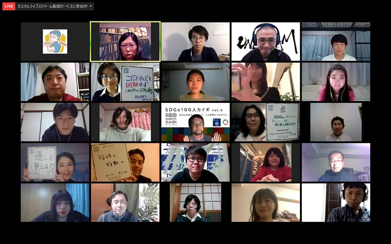 なお、2020年5月現在、新型コロナウイルス感染症が拡大している状況を受け「SDGs100人カイギ」はオンライン開催に切り替えている。2020年4月開催の第6回は、過去最大の150人の参加となった。