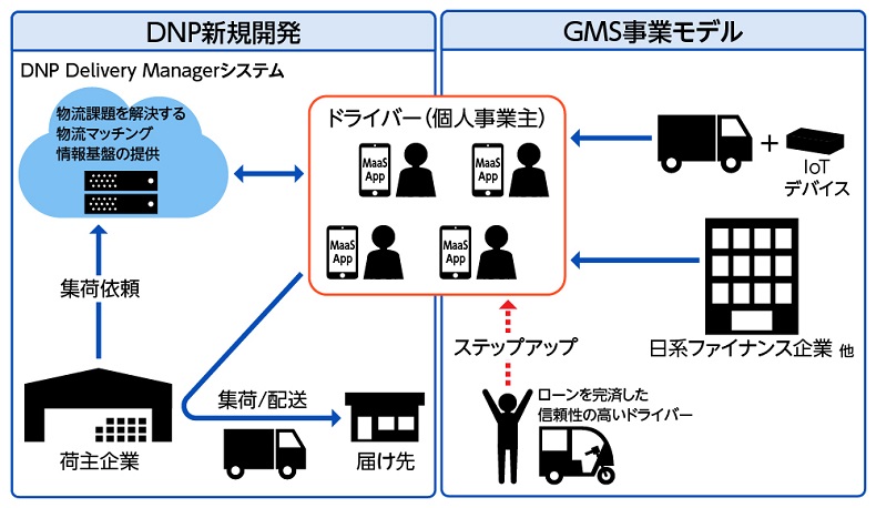 クルマを使って働きたくても、銀行口座を持てず、自動車ローンの審査に通らない人が世界に約17億人もいる。こうした人々に、ITを活用した金融サービス(フィンテックサービス)を提供し、クルマの購入をサポートしているのがGlobal Mobility Service株式会社(以下GMS)だ。 人々の期待に応えるとともに、社会課題を解決する価値の提供をめざすDNPは、GMSの理念に共感し、同社との事業提携によって、フィリピンにおいて「物流配送マッチングサービス」を展開。このサービスは、「MaaSアワード2020※」のビジネスモデル部門で優秀賞を受賞するなど、国内外で高い評価を集めている。今回、GMSのフィリピン現地法人のCEOを務める中嶋一将氏と、現地へも度々赴きGMSフィリピンの担当チームメンバーほかステークホルダーとの調整を進めるDNPのモビリティ事業部・神戸博文に話を聞いた。