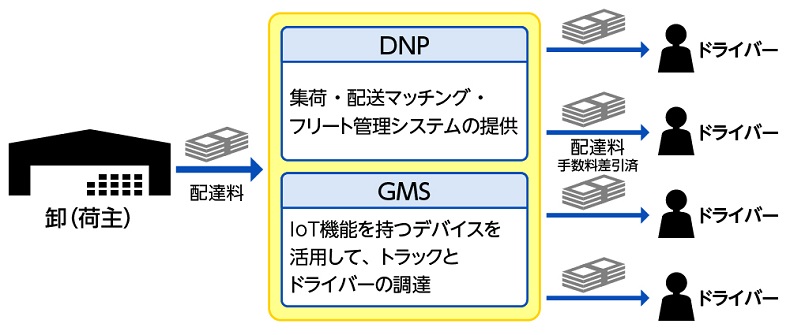 そこで、2つの社会課題解決に向けて辿り着いたのが、GMSのフィンテックサービスと連動し、荷主とドライバーをつなぐ「物流配送マッチングサービス」だ。