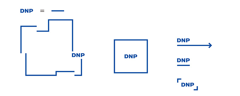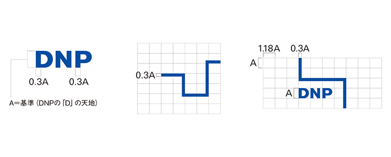 はい。グリッドは通常の正方形じゃなくて、タテ1:ヨコ1.18の比率で設計しました。これはコーポレートマークのタイポグラフィのタテ・ヨコ比率から生まれている、DNP独自のグリッドです。そして、ブルーラインの太さはDとPのタテ線の太さと一致します。つまり、「DNP」を出発点に、ブルーラインが派生していく広がり、つながりを見せています。