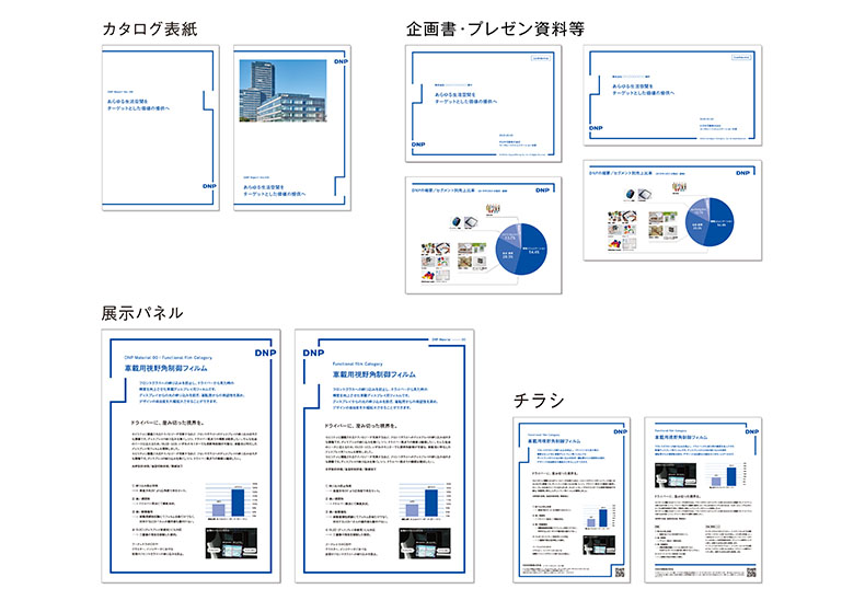 実際に、カタログや企画書、パンフレットなどに組み込んでみると、さりげなくて主張しすぎない。でも、それぞれの制作物を一堂に集めて並べてみると、一つの世界が生まれてきます。共通のテーマでつながり、多様な技術や才能の集まりであるDNPという会社が浮かび上がってくる仕掛けなのですね。
