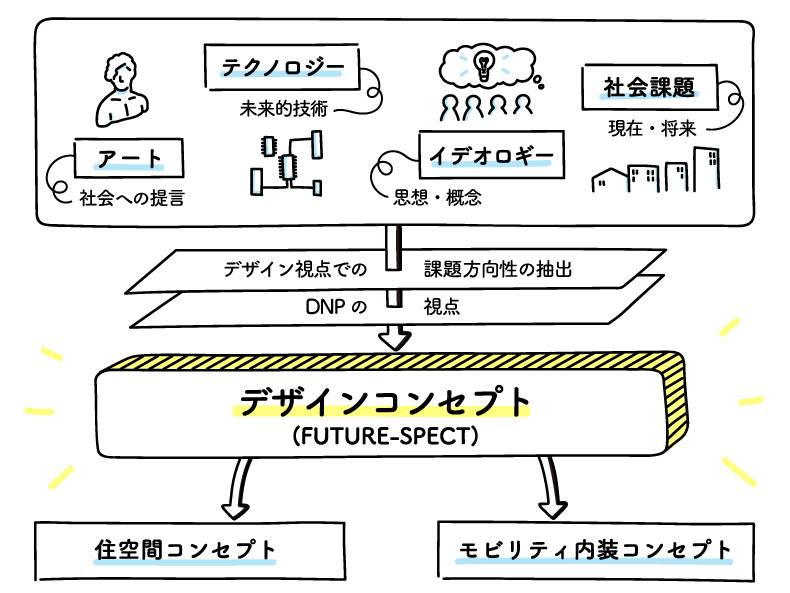 「社会課題」「Arts(芸術)」「Ideology(思想)」「Technology(新技術)」の要素についてDNP独自の視点で整理し、近未来のデザインコンセプトとしてまとめていくもので、ここから生まれるストーリーに沿って、複数のサーフェスデザイン案を提示していく。