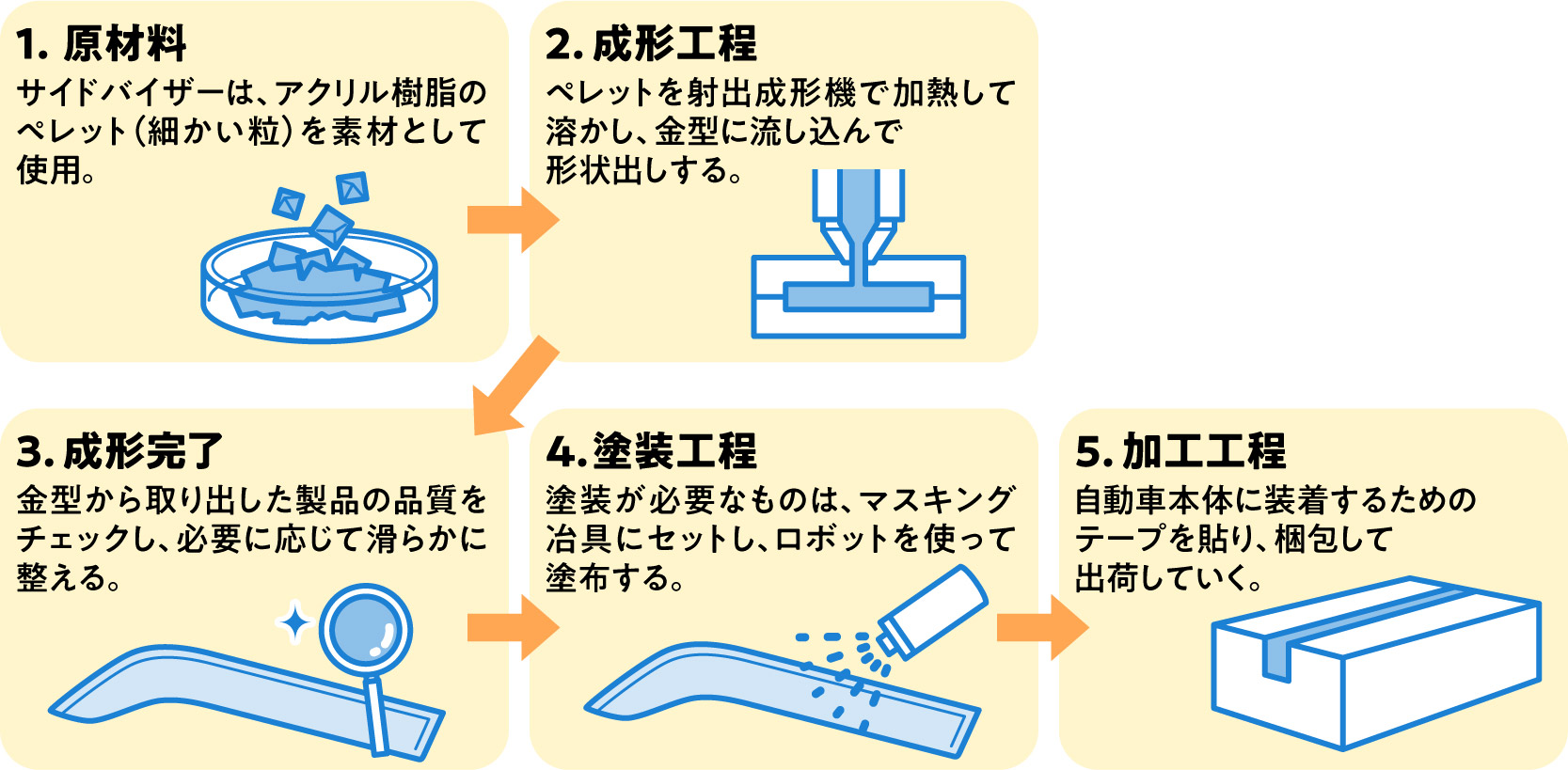 まず、自動車ごとの形状や使用条件に合わせて自在に成形できることが大事になるため、加工性・耐候性・耐薬品性に優れるアクリル樹脂を素材として選定しています。そこに、自動車用品として欠かせない「視界の確保(透明性)」や「耐熱性と耐衝撃性の両立」といった特性も持たせるため、材料配合に細かな調整を施しています。