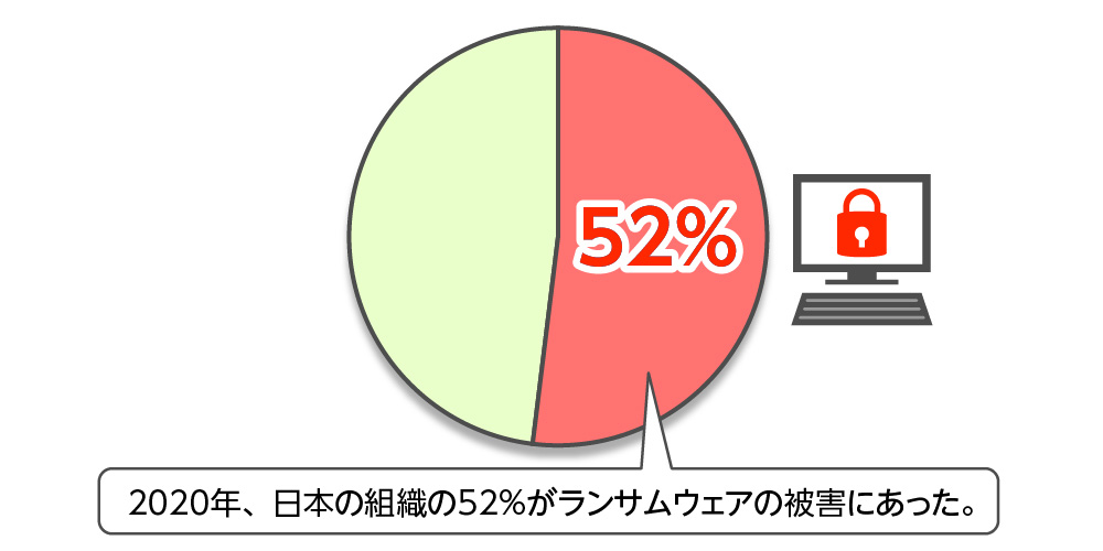 このランサムウェアの被害が近年拡大しており、独立行政法人情報処理推進機構(IPA)(※2)が毎年公表している「情報セキュリティ10大脅威」の2021年度組織部門の1位になっています。また、別の調査では、日本の組織の52%がランサムウェアの被害にあったと回答しています(図1)。
