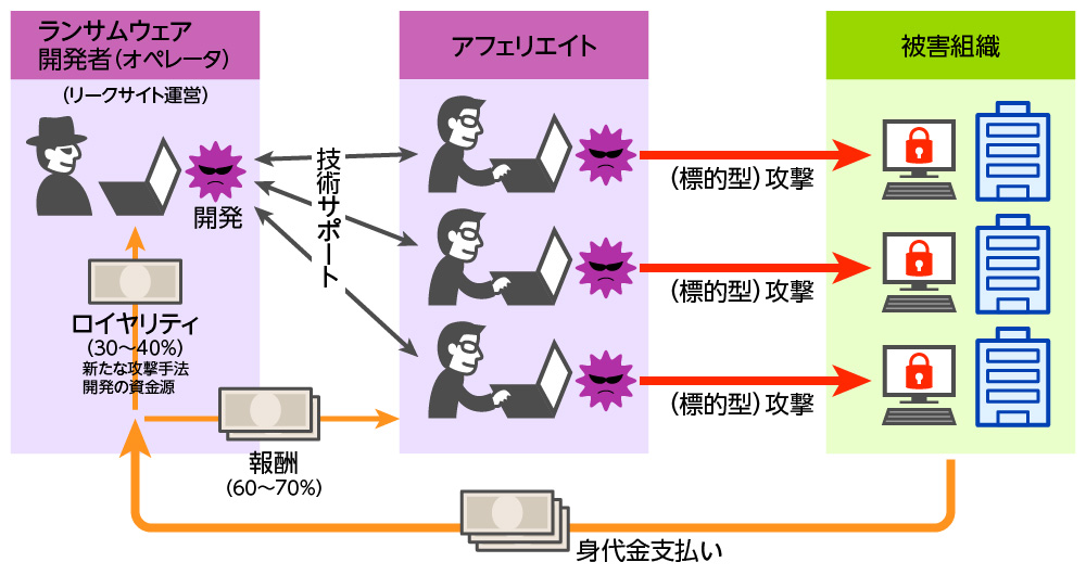 このように分業制の「犯罪のビジネスモデル」が構築され、ランサムウェアの攻撃インフラを提供するオペレータと実際の攻撃を行うアフェリエイトの役割を分担することで、攻撃規模の拡大とリスクの負荷分散を図っているのです(図2)。