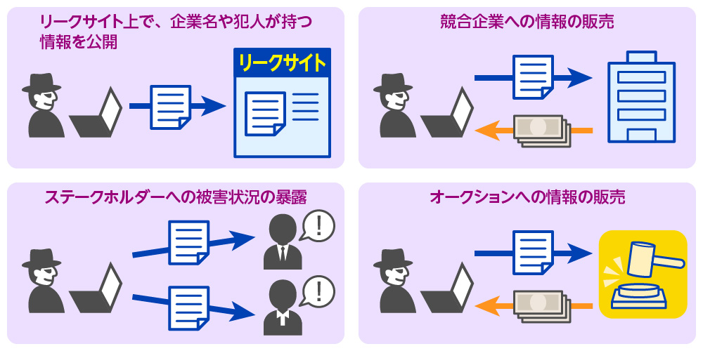 また2019年頃から、企業に身代金を要求するだけでなく、「被害企業の機密情報や顧客情報などをリークサイト上で公開する」「オークションで情報を販売する」といった方法で、盗み出した情報を不特定多数に公開することをちらつかせ、身代金を支払わせようとする多重脅迫が増えています(図3)。