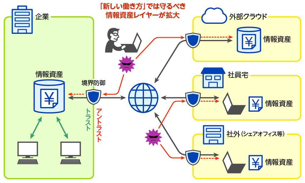 ゼロトラストが提唱されたのは2010年代初頭ですが、この考えに基づき、作業工程ごとに検証していくやり方は、業務を継続的に稼働させる「可用性」(※6)が低下することが敬遠されたのか、当時は広く普及しませんでした。その後、情報資産がクラウドやモバイル端末上に広がり、守るべき対象が増加・点在化していったことで境界防御の限界が指摘されるようになり、2019年頃からあらためてその価値が見直されています。現在この流れは、テレワークの普及によってさらに加速しています。