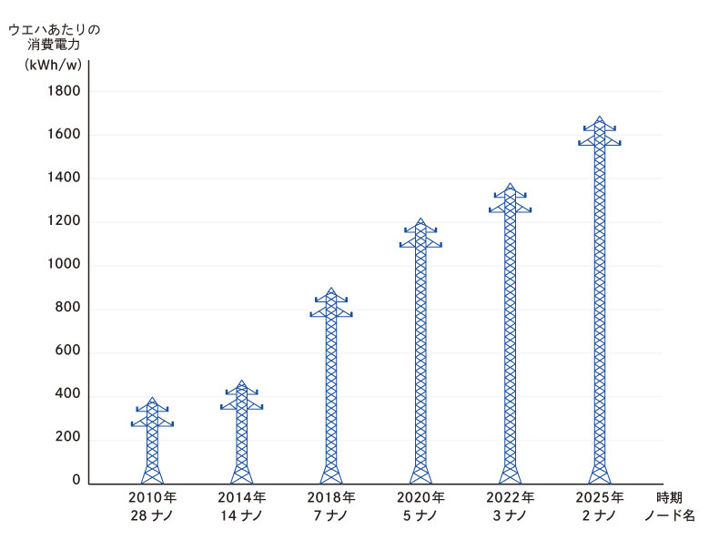 半導体製造は、微細化が進むほど消費電力が増加する傾向にあります。現在の最先端デバイスに相当する線幅5nmのウエハ1枚の製造には、一般的な家庭の約4ヵ月分の電力を消費するというデータもあります。 |