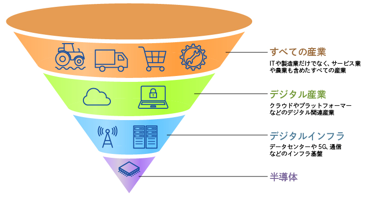 経済産業省の「半導体・デジタル産業戦略」では、カーボンニュートラルや地方創生、少子高齢化といった社会課題を解決していくには、半導体を起点にデジタルインフラ〜デジタル産業〜すべての産業へと広がるデジタル化が不可欠であると指摘しています。 |