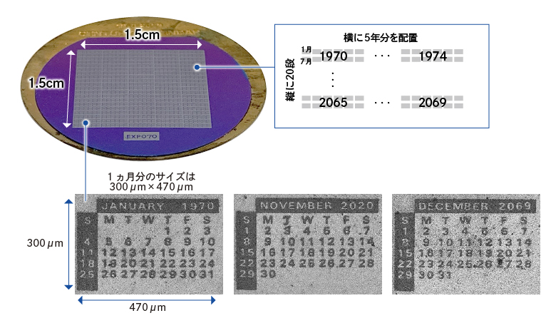 これは、シリコンウエハの1.5cm角内に100年分のカレンダーを彫り込んだ、当時としては画期的な高精度の展示品でした。1970年代初頭における半導体の標準的な線幅が10μmだったのに対し、「百年カレンダー」では5μm幅のパターンを実現し、DNPの技術力の高さを示しました。