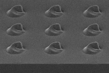 またDNPは、回路パターンにおける版の凹凸を基材に押し当てて転写するナノインプリントリソグラフィの製造方式を活かし、立体形状テンプレートの開発も進めています。この方式を採用することにより、自由な立体形状を形成することが可能となるため、これまでにない新しい素子や機能の実現が期待されています。すでにさまざまな形状のサンプルも作製しておリ、今後の3次元テンプレートへの応用展開が期待されます。