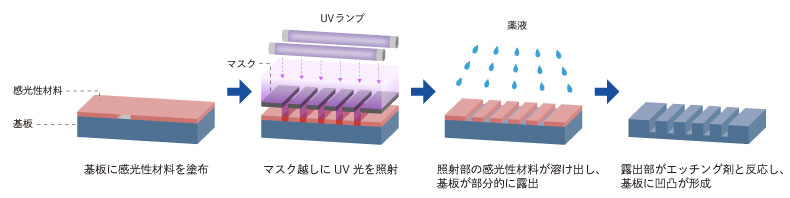 感光性材料を塗布した基板の表面に光を照射し、露光の有無によってパターンを形成する技術。DNPは、印刷用の版(刷版)を作る工程で使われてきたリソグラフィ技術を発展させ、nm(ナノメートル、10億分の1メートル)単位の精度が求められるフォトマスクや、μm(マイクロメートル、100万分の1メートル)単位の液晶ディスプレイ用カラーフィルターの製造などに応用してきました。 |