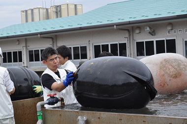 | 石巻市牡鹿半島で牡蛎養殖筏のブイを清掃する鬼澤さん(左) |