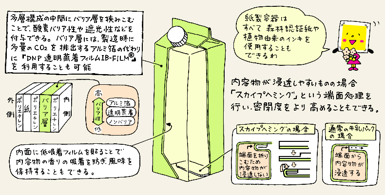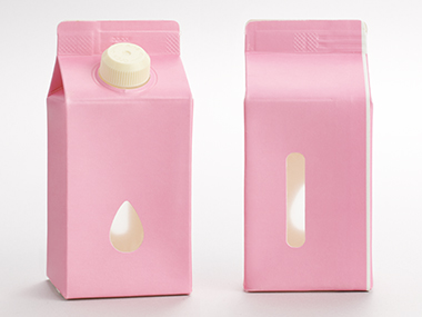 高度なコンバーティング技術によってバリア性を備えた透明フィルム「DNP透明蒸着フィルム IB-FILM®」を複数層のラミネートフィルムに挟み込むことで、内容物を目で確認できる“窓”を設けた液体紙容器を開発。利用の際に残量がわかるというメリットに加え、店頭陳列時に来店者の購買意欲を高める効果もあります。