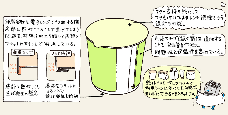 容器・包装におけるプラスチック使用量の削減が世界的な潮流となるなか、あらためてその価値が見直されている紙製容器。「加工の自由度」や「素材としての強度」といった紙本来の特性を活かして、市場は大きく広がっており、DNPも紙製の電子レンジ対応容器やラミネートチューブなど、多彩な製品を次々と生み出しています。今回は、この紙製容器の最前線についてご紹介します。