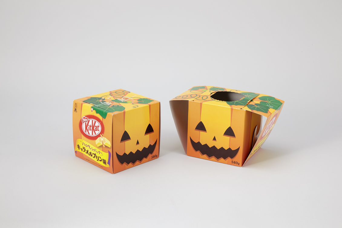 横にスライドして開ける仕掛けでお菓子を簡単に取り出すことができます。“トリック・オア・トリート”をみんなで楽しめるハロウィン用の限定商品などに使われています。非開封時は立方体の形状であり、運送時や店頭での積載効率が高い点も大きなメリットです。写真は、2018年の日本パッケージングコンテストで「パッケージデザイン賞」を受賞した製品です。
