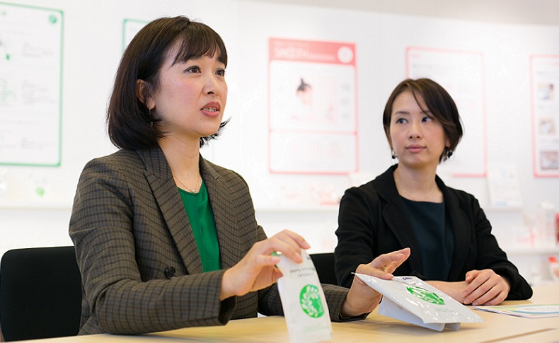 EU(欧州連合)が2030年までにすべてのプラスチック容器包装をリサイクルするリサイクル戦略を発表、日本でも環境省でプラスチック資源循環戦略が検討されるなど、自然環境に大きな影響を与える海洋プラスチックなどの問題が、世界各地で関心を集めています。 包装分野で国内最大規模の実績をもつDNPにおいても、独自の環境配慮パッケージシリーズ「GREEN PACKAGING」を提供するなど、さまざまな取り組みを手がけています。包装事業部の柴田あゆみ、尾見敦子の2名に、パッケージを作る企業としての責任、そして「GREEN PACKAGING」に込めた環境への思いを聞きました。