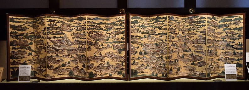 続いては、国の重要文化財に指定されている洛中洛外図屏風のひとつ、「洛中洛外図屏風 池田本」。岡山藩の池田家に所蔵されていたことから「池田本」と呼ばれています。二条城などの建物のほか、祇園祭の様子や庶民の日常など、約3100人以上が描かれている大作です。こちらもご覧いただきました。