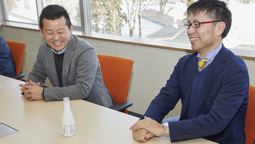 インタビューに答える高橋社長(左)とDNP包装事業部の波多野さん(右)