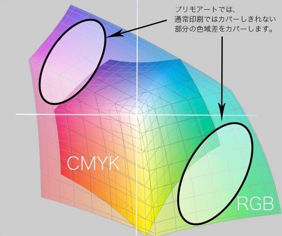 プリモアートは、通常の4色印刷ではカバーしきれない色域を再現できる。 |