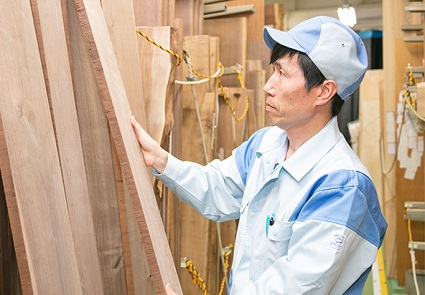 楠本は年に数回、欧州に出張する。目的は、「原稿」として使用するための天然木を買い付けることだ。展示会に足を運んで木目の最新トレンドを知り、顧客企業にプレゼンテーションしながら生活者の購買の動向をつかむことも重要な仕事だ。ヨーロッパの生活者はインテリア関係の商品に目が肥えており、とかくこだわりが強い。