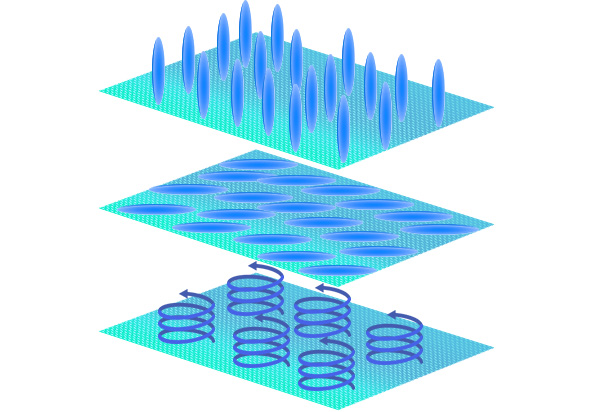 液体だが、一つひとつの分子が固体としての性質を持つ"液晶という状態"を技術者以外の人に説明するのは難しい。そこで黒田は時に、鉛筆の形をしている液晶の分子を擬人化して説明する。分子君の一人ひとりに「あなたは右を向いてください、あなたは左」と指示するのが、液晶層の下にある配向膜さん。この人が司令塔になって分子君たちのパターンを作っていく。しかし、空気に触れる液晶層の最上部では、言うことを聞かない分子君が「指示とは違う方向に向きたがる」ので、添加剤で制御することになる。そうして意図的に整列させた液晶分子君たちをフィルム上で固める。