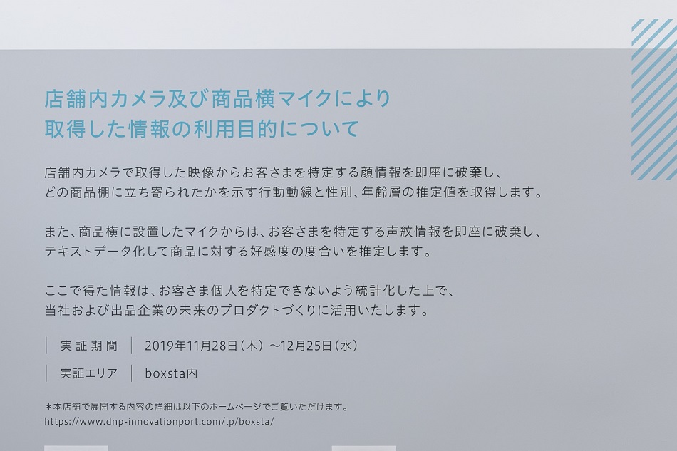 中でも特に注意を払ったのが、個人情報保護の視点に立った店舗設計だ。「店舗でのデータ収集は、生活者にはまだまだ抵抗がある」と浅野は話す。そのため「boxsta」では、取得する情報の種類や用途、取り扱いの方法などの説明を入口付近に大きく掲示しているほか、カメラやマイクをあえて隠さず、目に付く位置に配置している。