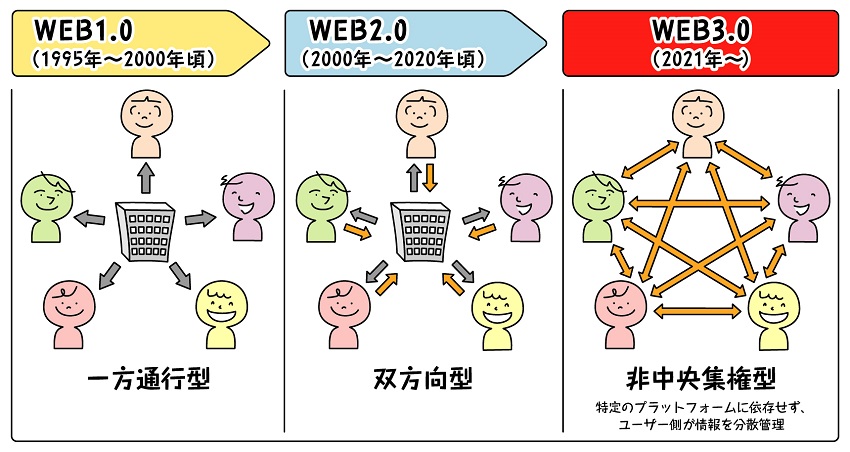 このブロックチェーンは、最近話題の「Web 3.0」を体現した仕組みとも言えます。主に特定のサーバーのWebサイト等を閲覧する一方通行の「Web 1.0」や、SNS・動画共有等のサービスでサーバー側とユーザーや、ユーザー同士の双方向コミュニケーションが活発になった「Web 2.0」に対し、「Web 3.0」は特定のサーバーや管理者も不要で、ユーザー自身が分散管理する非中央集権型となっています。NFTの浸透が加速する背景には、こうしたインターネット環境のトレンドも大きく影響しているわけです。
