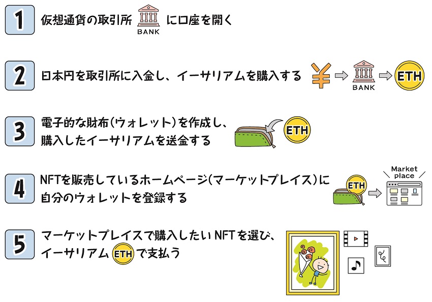 NFTを購入するには、一般的に、「イーサリアム」という仮想通貨を使って決済をします。具体的な手順は次の通りです。