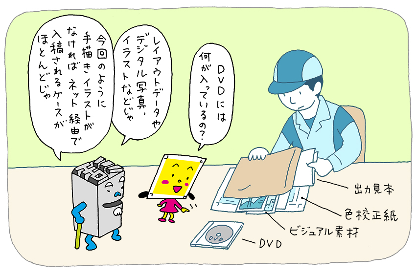 出版社から印刷会社に届いた素材を整理し、雑誌の企画や記事などの単位で専用の袋にまとめます。素材には、レイアウトデータ等が入った「パッケージメディア(DVD等)」、試し刷りとの比較に欠かせない「出力見本」、色調整の指示が入った「色校正紙」、ページレイアウトで使用するイラスト等の「ビジュアル素材」などがあります。