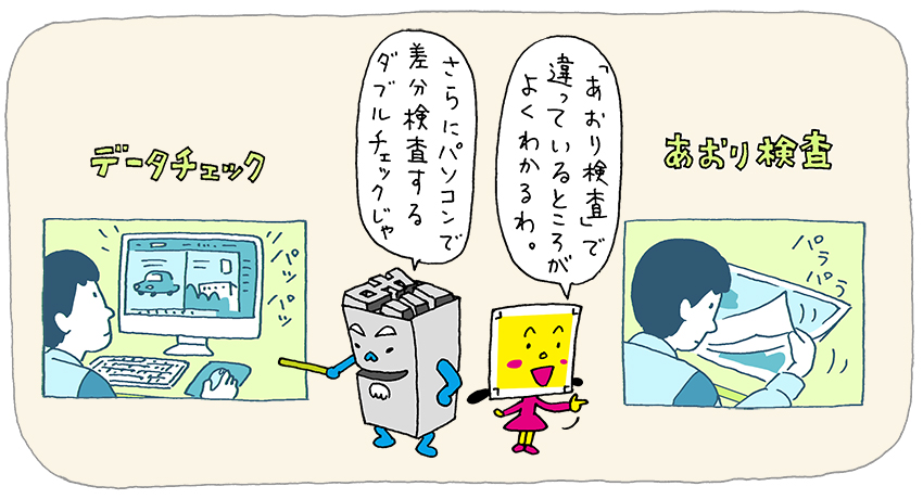 工場等の現場で修正した内容が、出版社等の指示を正しく反映しているか、出力見本と修正指示を比較してチェックします。比較する方法には、「あおり検査」と「デジタル検査」の2種類があります。