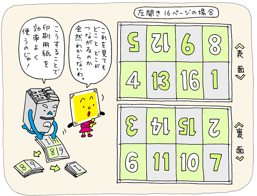 雑誌の印刷は、大きな印刷機に合わせて片面8ページ分、表裏で16ページ分を一気に印刷します。印刷した大きな紙を折って裁断した際に、ページが順番に正しく並ぶように、印刷用にページを並べる作業を「面付(めんつけ)」といいます。
