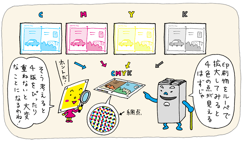 「網点」=シアン・マゼンタ・イエロー・ブラックの4色でフルカラーを表現するために使われる微細な点。点の間隔を広くすることで薄い色が表現できて、複数の色の版を重ねることで多様な色が表現できるなど、点の密度や大きさを調整することで多彩な加工が可能となります。