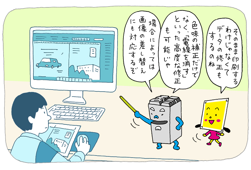 編集部からの修正指示に従って、画像や文字を修正します。床の汚れを消すなどの画像修正や、肌の色をきれいにするなどの色味調整は、専用のソフトを使って行います。