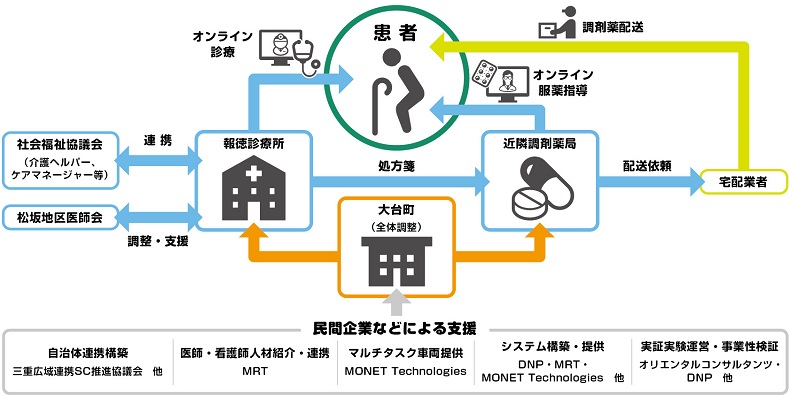 こうした流れを受け、2021年11〜12月、オンライン診療を手掛けるMRT株式会社を中心に、DNPなどが参画して、「オンデマンド医療MaaS」の実証実験が行われた。自分の足で診療所まで行くことが困難で、オンライン診療を受けるための機器や知識がない患者さんのご自宅にMONET Technologies株式会社のマルチタスク車両で訪問し、オンライン診療を試みる内容だ。