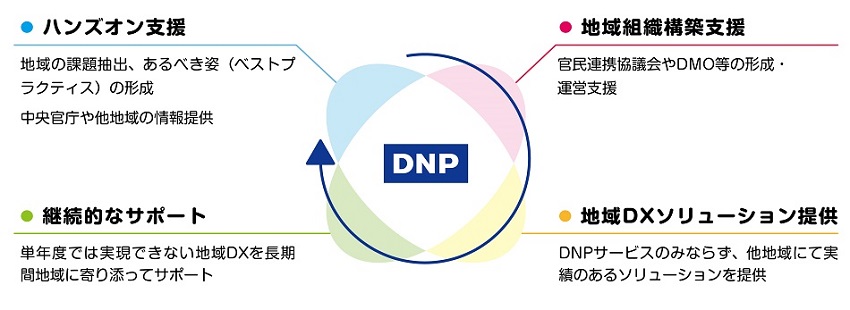 DNPは地域活性化の実現に向けて、DXの推進・各種課題の抽出・ビジョンの策定・推進体制の構築など、あらゆる業務プロセスに対して、自らが参画する“ハンズオン”方式で支援している。 |
