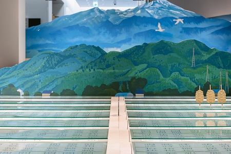 もうひとつは、2022年に行われた、書体デザイナー・鳥海修氏の展示「もじのうみ: 水のような、空気のような活字」です。鳥海氏のルーツとなる山形県・庄内平野や鳥海山のイラストを中央に設置したり、鳥海氏の書体が使われている書籍をずらっと並べたり。近年のトレンドである空間演出という視点も加わり、デザイナー以外の方も楽しめるエンターテインメント性に溢れた展示内容でした。