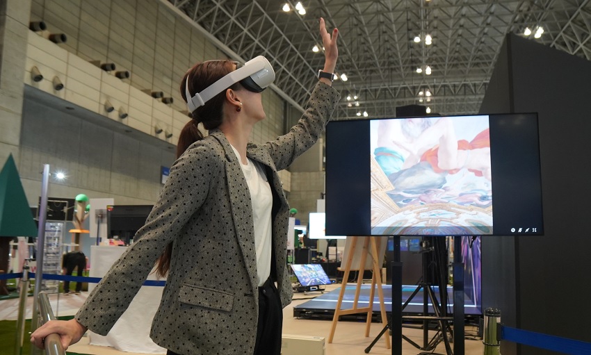 新たな鑑賞システムをはじめ、さまざまな分野に対応できるDNPのインタラクティブコンテンツ。今後拡大が予想されるメタバース市場への参入も視野に入れている。特に「みどころウォーク」は、事業の軸足をSNSからメタバースに移行したメタ社からも、「美術品の再現のクオリティが今まで見たことがないほど高い」と高評価を受けている。このシステムは、メタ社のヘッドマウンドディスプレイを採用しており、2022年11月開催のIoT展示会「CEATEC 2022」では、メタ社の展示スペースで披露されるなど(写真参照)、今後のメタバースへの活用に期待がかかる。