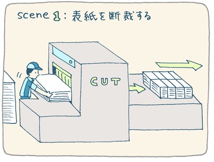 発色や耐久性を考慮して本文とは別に印刷することが多い表紙は、次の「丁合(ちょうあい)」の工程に進む前に断裁して、サイズを合わせます。大きな刃が付いた断裁機にセットして4辺をカットしたのち、「表紙(ひょうし)まわり」ごとに切り分けたあと、折機で二つ折りにします。