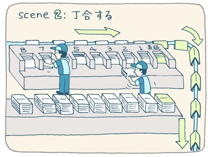 横に長いラインを数名のスタッフで分担していますが、丁合は一定のスピードでどんどん進んでいくので、集中力とスピーディな対応が求められます。