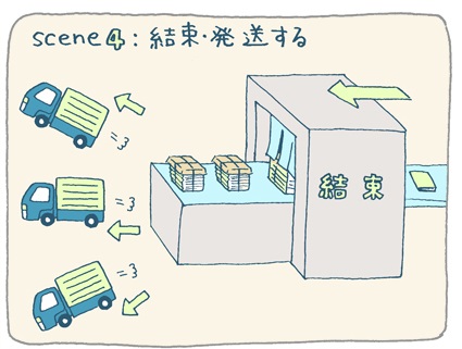 付録がある場合は、完成した本に乗せて、数部ごとにバンドで結束します。結束したものを輸送用のパレットに積んでビニールで固定し、発送します。