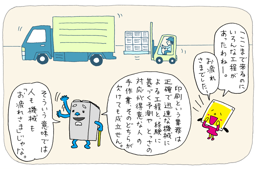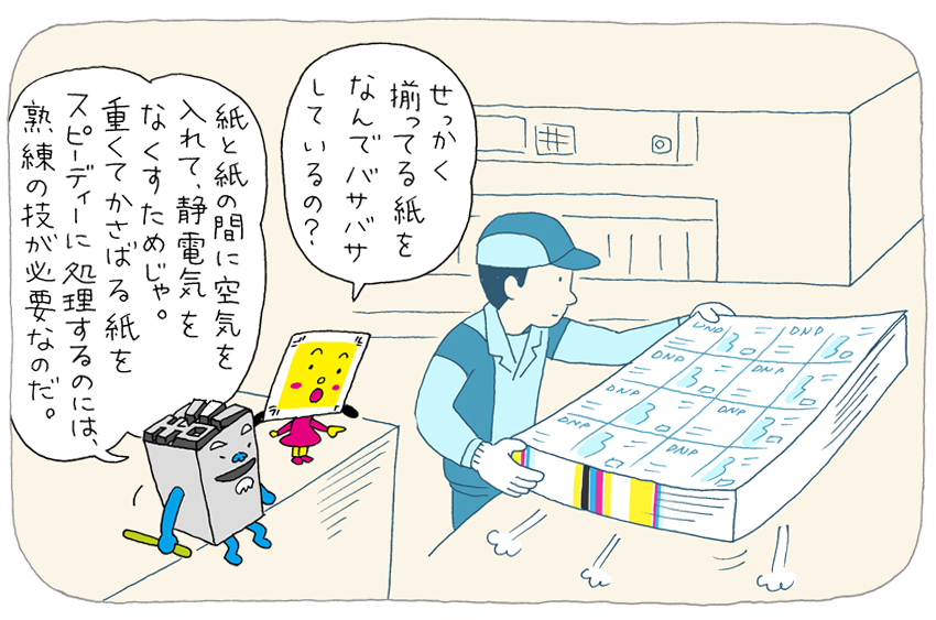 DNPグループは今、顔認証等のセキュリティサービスや、文化財の価値を高めるデジタルアーカイブ、メディカル・ヘルスケアやエネルギー関連の事業、各種エレクトロニクス製品など、幅広い分野で社会や人々に新しい価値を提供しています。これら多様な製品・サービスは基本的に、「本」をつくってきた印刷技術を応用・発展して実現させてきました。そうしたDNPの基盤とも言える「印刷」の現場を、“活じい&トンボちゃん”が潜入レポートします!この記事は、雑誌印刷の工程を例に、「#1 版を作る」「#2 印刷する」「#3 製本する」の全3回で印刷の仕組みを紹介するシリーズの第3回です。