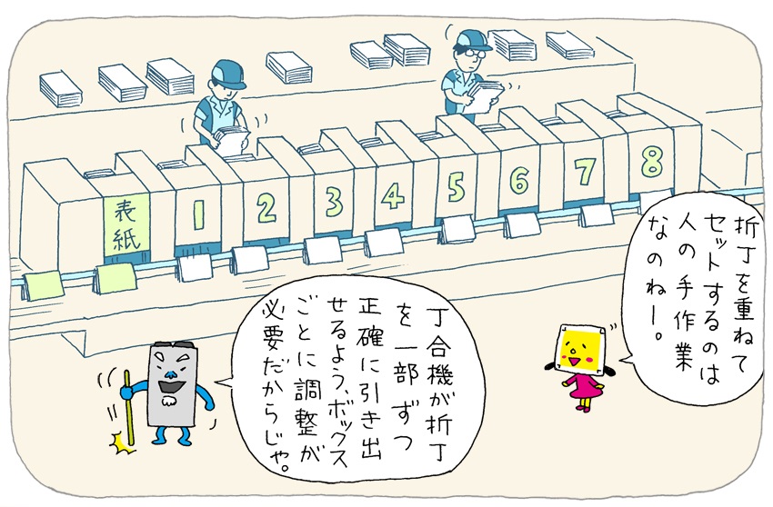 紙の厚さや種類、貼り込み加工の有無などによって、機械が折丁を1部ずつ正確に引き出せないケースがあるため、丁合機の各ボックスの設定調整や稼働チェックが欠かせません。