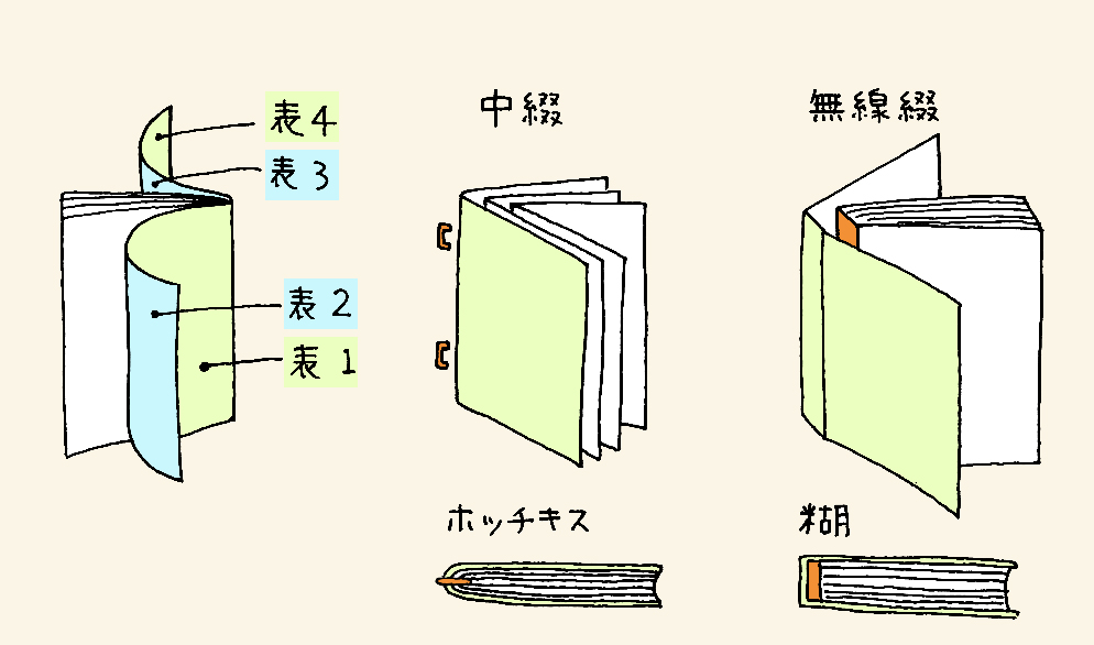 「中綴」=現在の製本の方法は、主に「中綴(なかとじ)」と「無線綴(むせんとじ)」の二種類に分かれます。「中綴」は折丁を開いた状態で重ね、真ん中を針金で固定する方法。「無線綴」は折丁を閉じた状態で重ね、背表紙にあたる部分をノリで固定する方法。前者は雑誌やパンフレット等のページ数が少ないものに、後者は書籍や辞典等のページ数が多いものに向いています。