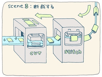 本づくりの最後は、「#2 印刷する」編で印刷したページや表紙などを正しく重ねて、一冊の本に仕上げる「製本」のパートです。大まかな流れは、①本文とは別に進行していた表紙を断裁する → ②すべてのパーツ(折丁)を正しい順番に重ねる → ③重ねたものを綴じて全体を断裁する → ④結束して発送する、の4つ。完成品を出荷するまでの最終工程でもあり、一層正確かつスピーディな作業が求められます。