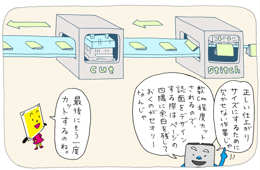 丁合が終わって各ページが正しい順番で並んだら、真ん中を針金(ステッチャー)で綴じます。そして、綴じていない三つの辺をカットする「三方断裁」を行うと、本の完成です。