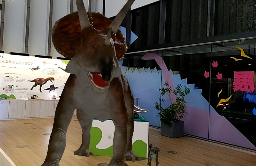 「見かたを変える、ふしぎな恐竜展」では、同種のイベントでよくある恐竜の骨格標本や化石などの展示は行っていません。しかし、所定の場所から二次元コードを読み込んだスマートフォンをかざして会場を見ると、なにもないはずの空間にバーチャル恐竜が出現! 会場フロアにはがっしりした体躯のトリケラトプスが、建物の吹き抜け部分からは長い首をもたげるブラキオサウルスが登場するその迫力は圧倒的です。