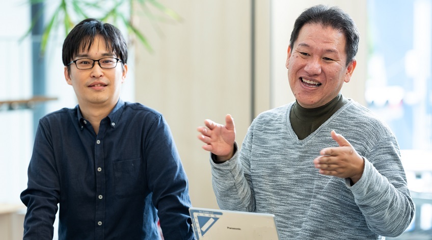 インタビューに笑顔で答える伊賀上(右)と端山(左)の写真